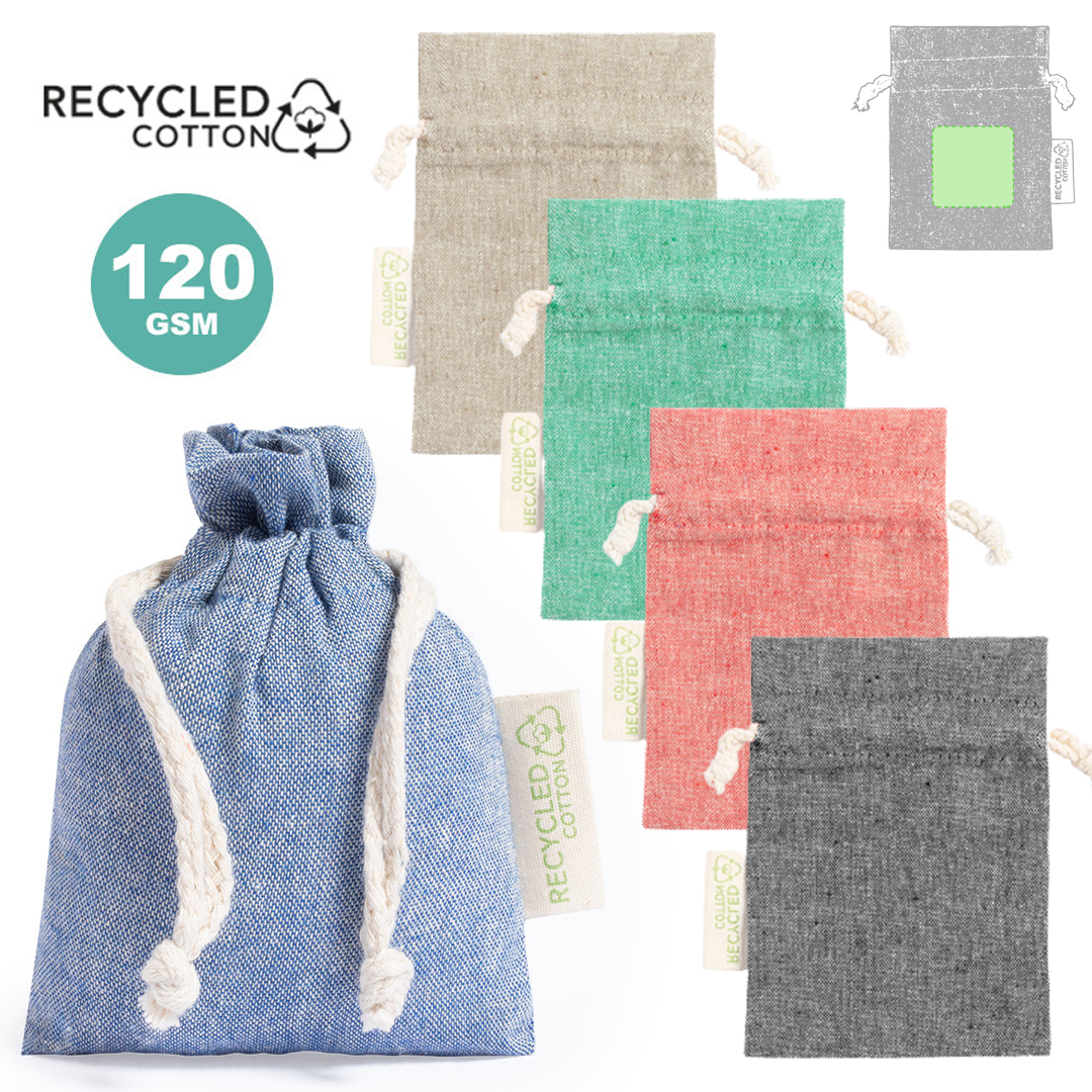 Bolsita de línea nature y tamaño 10x14 cm. Con cierre de cordón y fabricada en 100% algodón reciclado GRS de 120g/m2. Fácil marcaje y especialmente diseñada para pequeños objetos, con distintivo algodón reciclado en etiqueta exterior. Disponible certificación GRS (Global Recycled Standard / Estándar de Reciclaje Global), que garantiza el origen reciclado del material usado para fabricar el producto. Disponible en variada gama de colores.