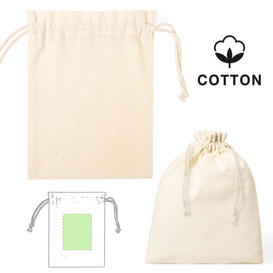 Bolsita de línea nature en material 100% algodón de 105g/m2. Tamaño 15x21 cm, de acabado cosido y con cordones autocierre de algodón.