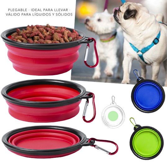 Bowl plegable para mascotas en resistente material TPR. Diseñado para sólidos y líquidos, con 450ml de capacidad y mosquetón de transporte metálico a juego. Disponible en variada gama de colores.
