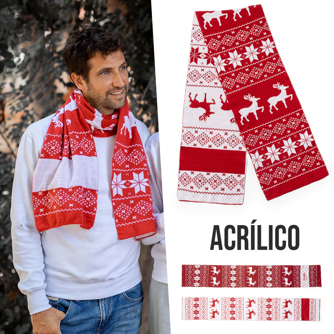 Divertida y cálida bufanda con motivos navideños. Un original regalo para lucir con estilo en navidad. Fabricada en suave poliéster acrílico y presentada en una bolsa individual reciclada. Cuenta con zona especial para el marcaje.