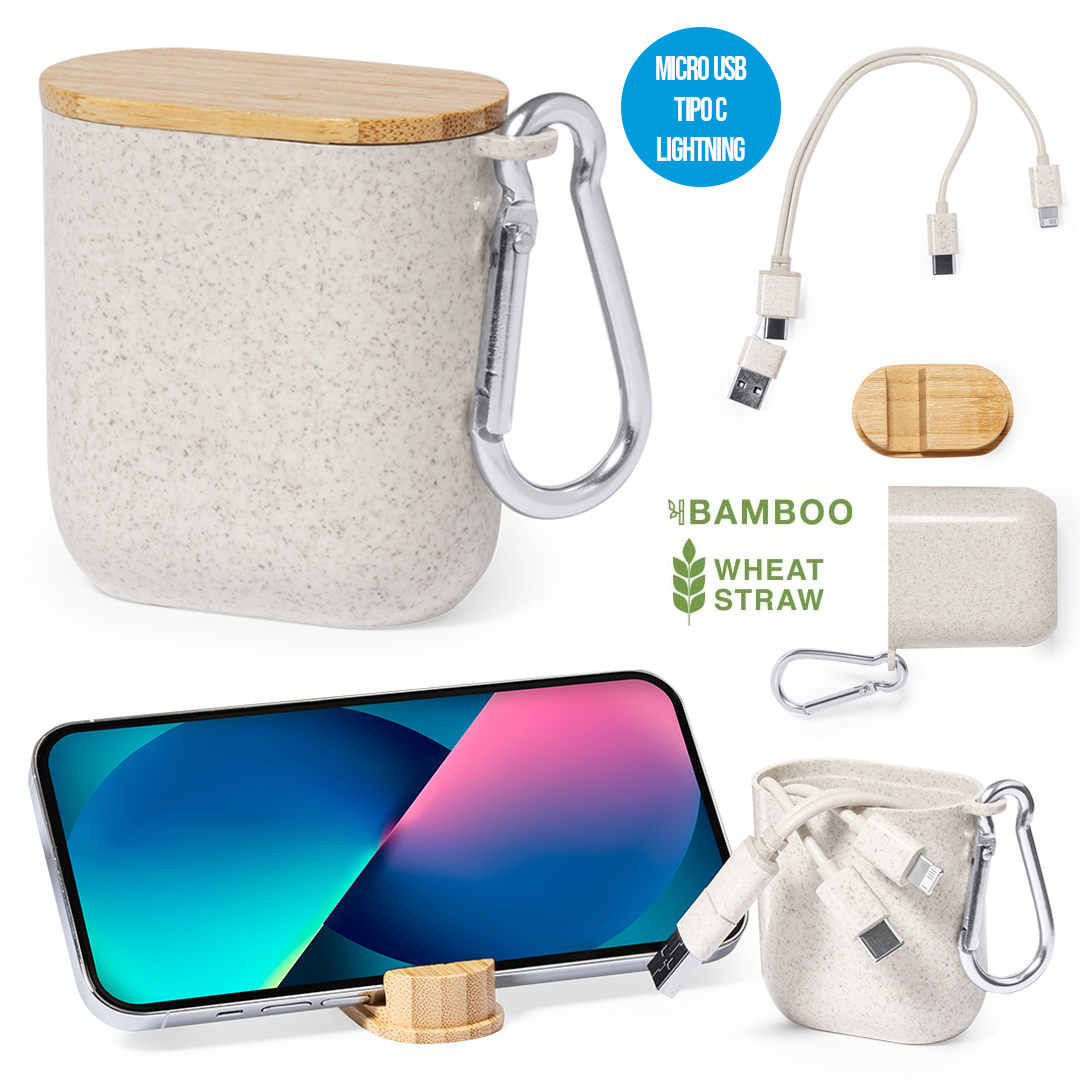 Cable cargador fabricado en fibra de trigo. Con conexiones de entrada Tipo C y USB y salidas Tipo C, Lightning y Micro USB. 5V DC 2.4A. Presentado en elegante estuche de diseño fabricado en fibra de trigo y tapadera de cierre en bambú, con función soporte para smartphones. Elaborado con elementos vegetales para así fomentar la utilización de materias primas naturales y reducir las emisiones contaminantes. Conexión Micro USB, Tipo C y Lightning 5V DC 2.4A