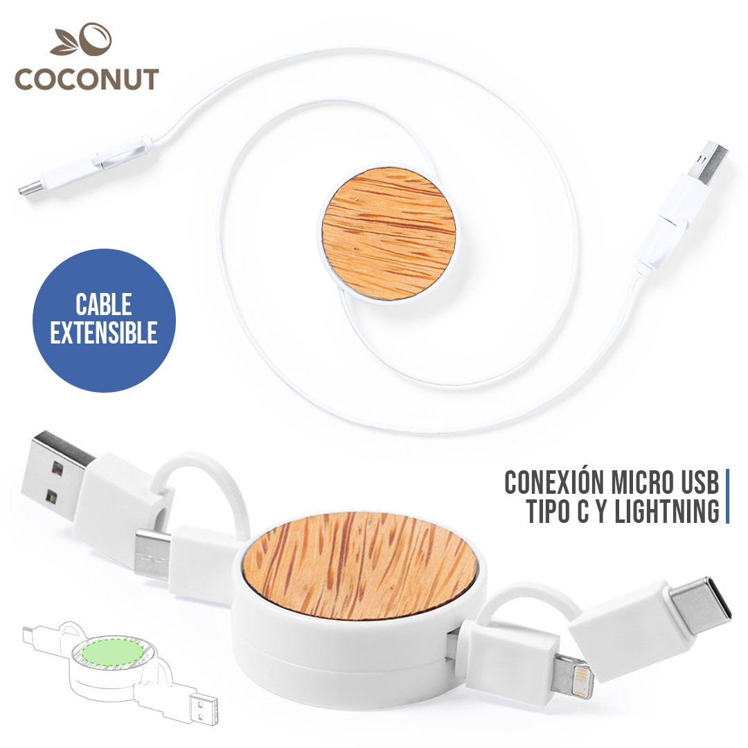 Cable extensible USB con función cargador y de transferencia de datos. De línea nature y fabricado en coco del que, tras el consumo de su fruto, se pueden obtener multitud de productos, contribuyendo a la sostenibilidad del planeta y fomentando el uso de materias primas naturales. Conexiones Tipo C (entrada y salida), y dual Micro USB/Lightning. Con zona lisa para marcaje y presentado en caja individual de diseño eco en cartón kraft. Apto para transferir datos. Cable Extensible. Conexión Micro USB, Tipo C y Lightning 9V DC 2.1A