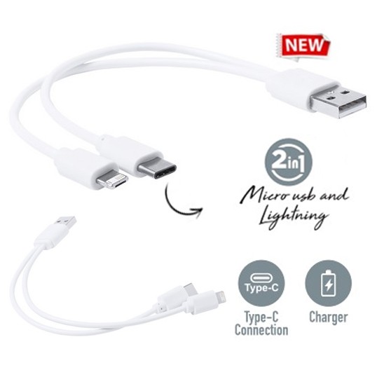 Cable cargador USB con conexiones Tipo-C y dual micro USB/Lightning. En diseñó minimalista de color blanco. Conexión Micro USB, Tipo C y Lightning 5V DC 1A