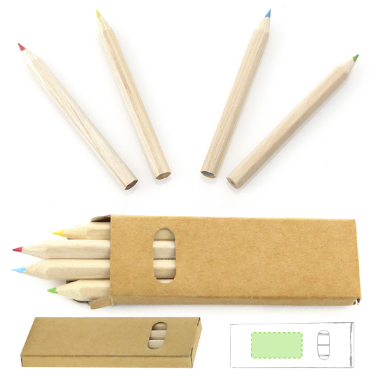 Caja de 4 lápices de madera con cuerpo hexagonal de acabado natural y minas en colores azul, amarillo, verde y rojo. Presentados en caja de cartón natural con ventana. 4 Lápices