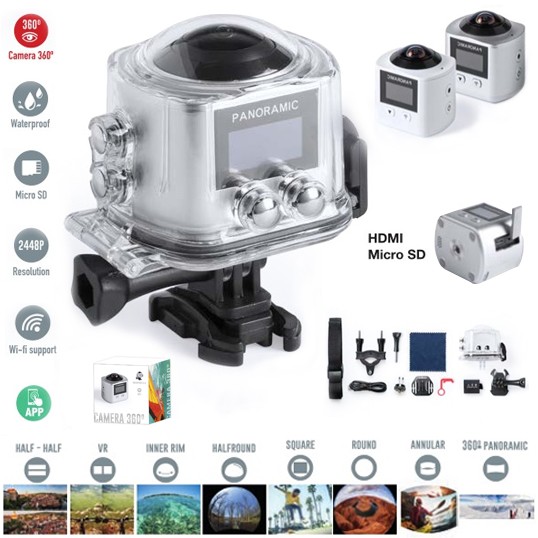 Cámara deportiva 360° de alta calidad de captura de vídeo HD 2448p, de diseño compacto y resistente, especialmente diseñada para uso intensivo. Incluye carcasa sumergible y multitud de accesorios para ajuste en casco, manillar o cinturón, así como correas ajustables para cabeza y torso. La versatilidad y resistencia de esta cámara deportiva la convierten en el gadget perfecto para capturar, con una calidad excepcional, cualquier actividad deportiva o de ocio en 360°. Con función Wi-fi, cámara de fotos Full HD 1080p, ranura para tarjetas micro USB de hasta 64 GB de capacidad, pantalla LCD de 0,96 pulgadas, sistema multilenguaje, y recargable mediante cable mini USB -incluido-. Presentada en atractiva caja de diseño. 2448P. Wifi. Pantalla LCD 0,96"". 10 Accesorios. Multilenguaje. Batería 1100 mAh