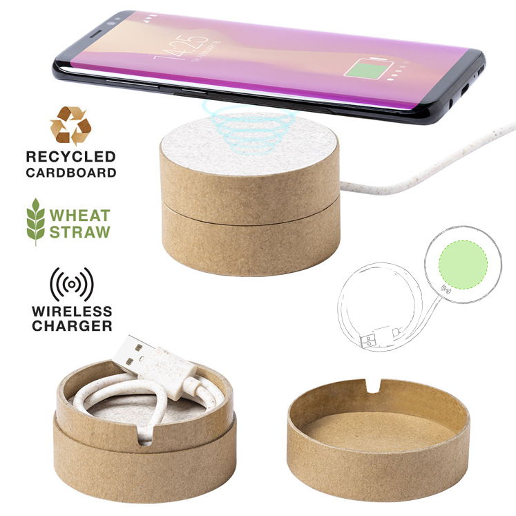 Original cargador inalámbrico circular de línea nature. Carcasa en cartón reciclado, contribuyendo a la conservación de los bosques y reduciendo considerablemente la huella de carbono, con superficie de carga y cable en caña de trigo. Compartimento interior para guardar el cable y poder llevarlo a cualquier lado. Indicador LED de estado de carga, compatible con smartphones con tecnología de carga inalámbrica y presentado en atractiva caja de diseño eco, con manual de instrucciones en español e inglés. Inalámbrico 5W