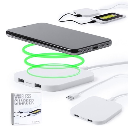 Cargador inalámbrico de diseño minimalista en color blanco. Con salida USB dual extra de 2.100 mA de capacidad para carga simultánea de dos dispositivos. Con base antideslizante. Compatible con dispositivos equipados con tecnología de carga inalámbrica y presentado en atractiva caja de diseño. Inalámbrico 10W. 2 Salidas USB