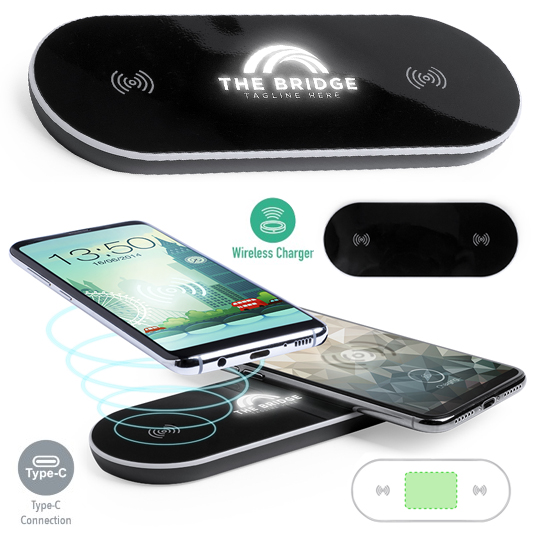 Cargador inalámbrico para carga simultánea de hasta 2 dispositivos. En elegante color negro, con luz led interior y un recubrimiento exterior especialmente diseñado para marcaje en láser, con el que conseguirá que su publicidad o marca quede iluminada con luz blanca. Base antideslizante y compatible con dispositivos equipados con tecnología de carga inalámbrica. Presentado en atractiva caja de diseño. Cable USB incluido. Luces Led. Inalámbrico 5W