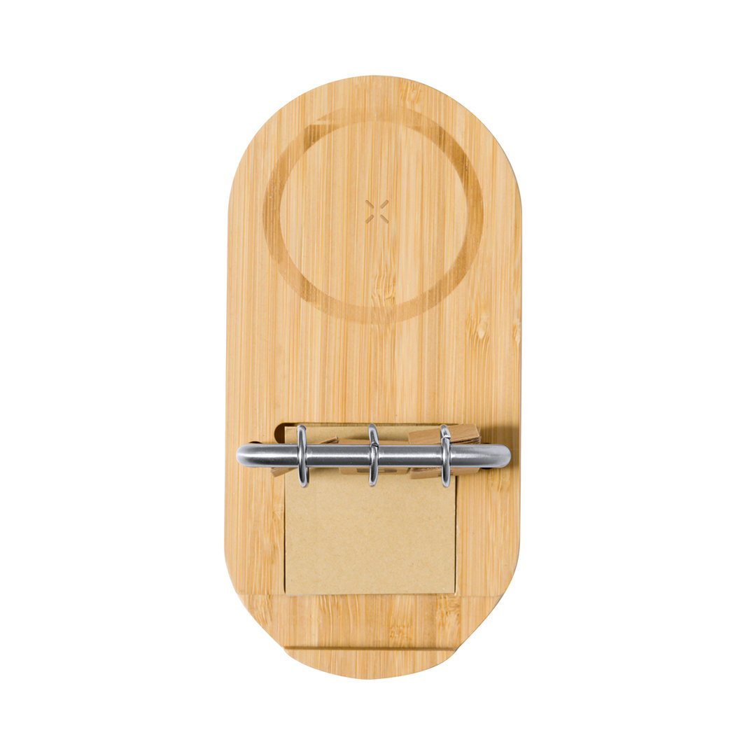 Cargador multifunción inalámbrico 15W fabricado en bambú. Incluye soporte para smartphone y calendario perpetuo, además de un bloc con 50 notas adhesivas acabado kraft de 4,5x4,5 cm. Salida USB y entrada y salida Tipo C, permitiendo cargar de manera simultánea hasta 3 dispositivos (1 mediante carga inalámbrica, 1 mediante cable Tipo C y 1 por cable USB). Compatible con dispositivos equipados con tecnología de carga inalámbrica. Amplia superficie de marcaje y presentado en caja individual de diseño kraft. Materiales como el bambú fomentan la utilización de materias primas naturales, reduciendo las emisiones contaminantes. Proviene de una planta de gran resistencia y versatilidad, con crecimiento y regeneración rápidos, siendo una excelente alternativa al uso de madera tradicional. Fabricado conforme a los estándares RoHS y en cumplimiento con los siguientes requisitos de seguridad: Sistema de protección contra sobrecalentamiento. Sistema de protección contra sobrecarga. Sistema de bloqueo para evitar cortocircuitos. Inalámbrico 15W. 50 Notas Adhesivas 4,5 x 4,5 cm. Salida USB. Salida y Entrada Tipo C