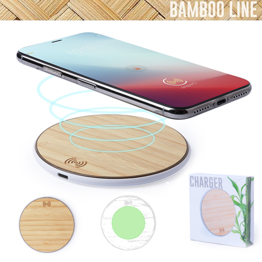 Cargador inalámbrico de línea nature, con base de carga en madera de bambú. Base antideslizante y compatible con dispositivos equipados con tecnología de carga inalámbrica. Presentado en atractiva caja de diseño. Cable USB incluido. Inalámbrico 10W
