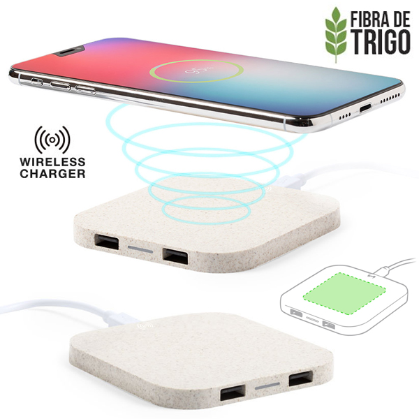 Cargador inalámbrico de línea nature. Carcasa en caña de trigo, para así fomentar la utilización de materias primas naturales y reducir las emisiones contaminantes. Con salida USB dual de 2.100 mA de capacidad para carga simultánea de hasta 3 dispositivos (1 por carga inalámbrica y 2 por cable). Base antideslizante y compatible con dispositivos equipados con tecnología de carga inalámbrica. Presentado en atractiva caja de diseño eco. Inalámbrico 10W. 2 Salidas USB