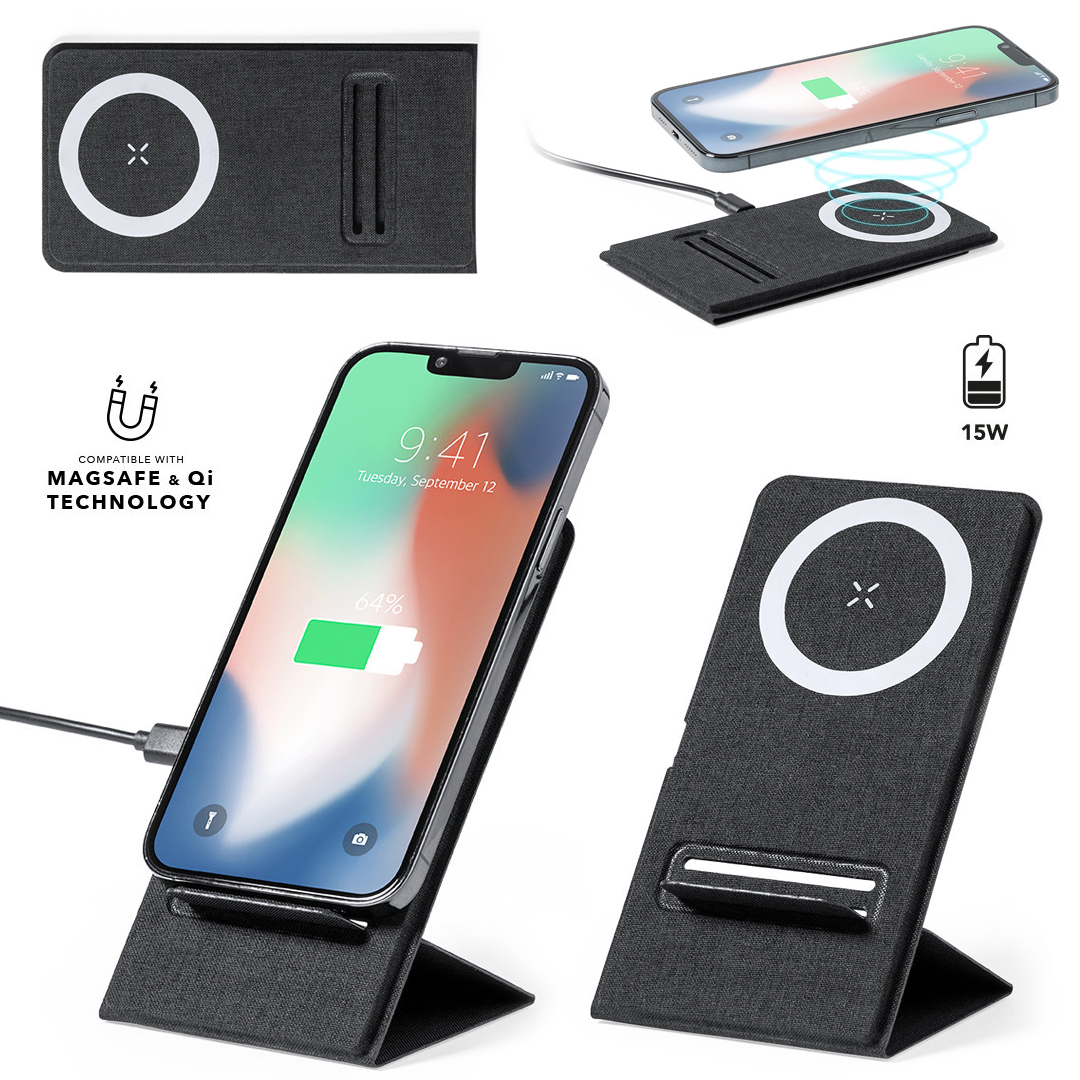 Cargador inalámbrico 15W. Fabricado en resistente poliéster 300D y con fijación magnética para poder usar el dispositivo mientras se produce la carga del mismo e incluyendo anillo adhesivo. Válido para todos los dispositivos con tecnología Magsafe y Qi. Plegado de pequeño tamaño para fácil transporte y presentado en atractiva caja individual de diseño. Inalámbrico 15W. Magnético. Plegable