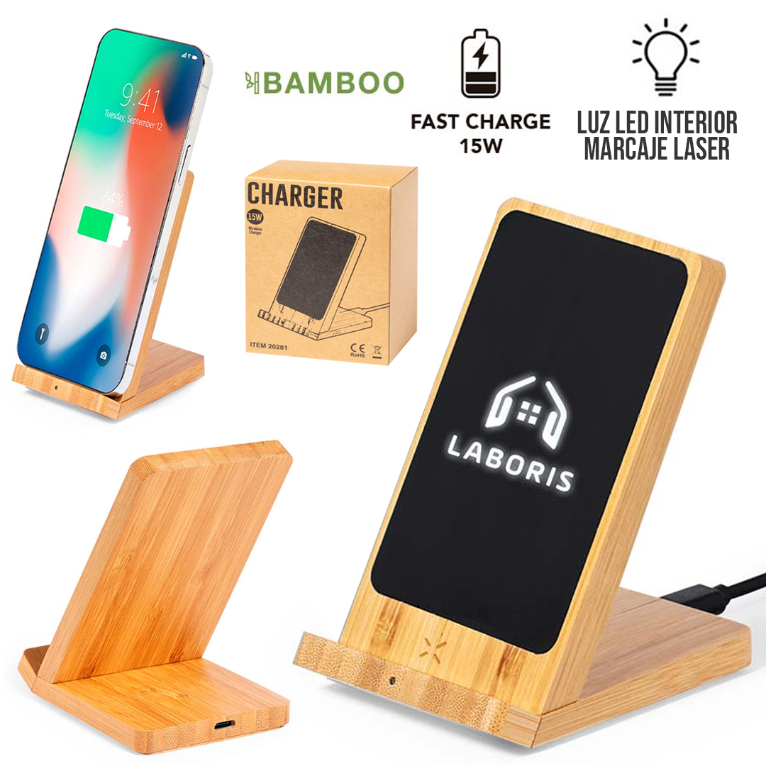 Cargador inalámbrico con función soporte para smartphone. Fabricado en bambú, con superficie en elegante color negro. Luz led interior y recubrimiento exterior especialmente diseñado para marcaje en láser, iluminando así el logotipo. Con función carga de 15W y compatible con dispositivos equipados con tecnología Qi. Amplia superficie de marcaje y presentado en atractiva caja de diseño kraft. Luces Led. Inalámbrico 15W
