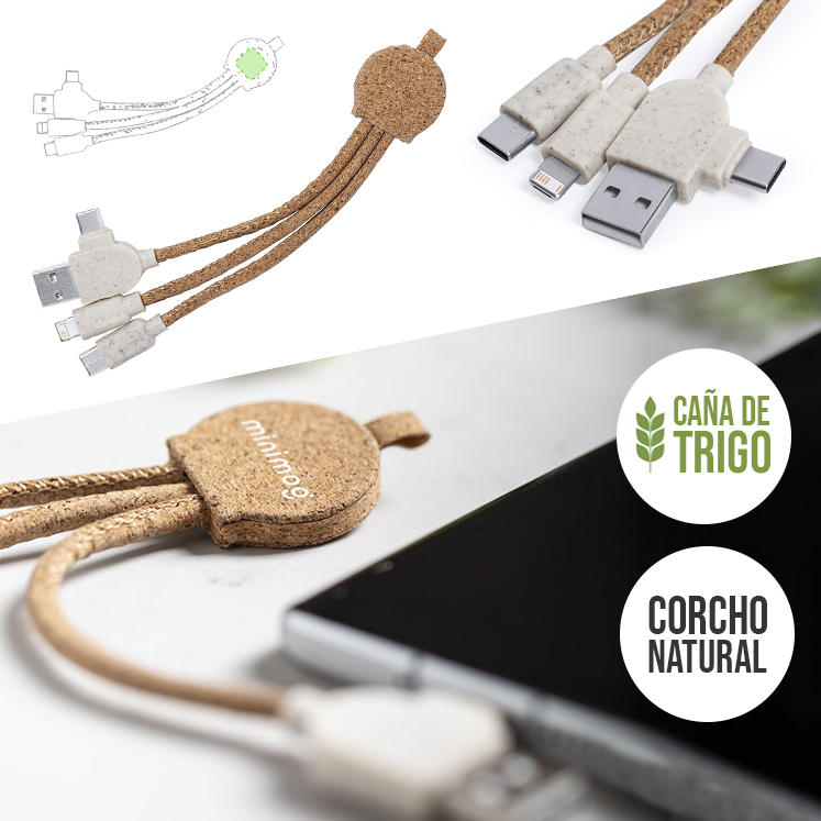 Cable cargador USB de línea nature, fabricado en corcho natural y con accesorios en caña de trigo, para así fomentar la utilización de materias primas naturales y reducir las emisiones contaminantes. Con conexiones USB, tipo C (entrada y salida) y dual micro USB-Lightning. Con accesorio para colgar y zona lisa para marcaje. Presentado en bolsa individual autocierre de diseño eco. Conexión Micro USB, Tipo C y Lightning