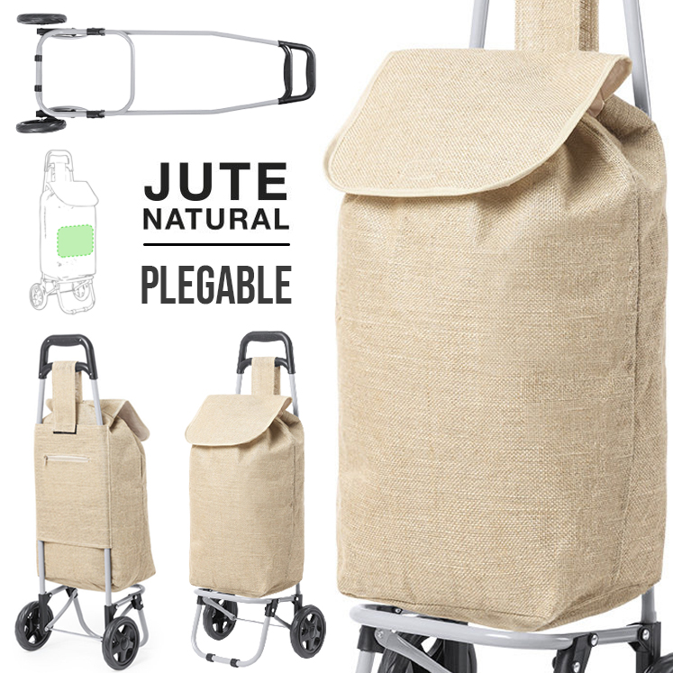 Carro de compra plegable y línea nature. Fabricado en resistente yute, fomentando la utilización de materiales naturales y así ayudar a la sostenibilidad del planeta. Con asa reforzada, cuerpo metálico tubular, bolsillo de cremallera posterior y soportes con gomas de protección. Ruedas reforzadas de alta calidad. Plegable
