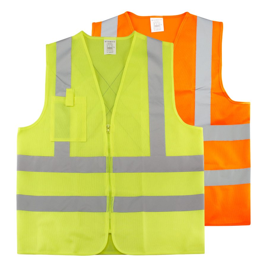 Chaleco Reflectante de Seguridad modelo "Traffic", 100% tela poliéster fluorescente con bandas reflectantes color plateado de 5 cm. de ancho. Incluye cierre eclair y bolsillo delantero superior derecho. Cumple con norma vigente de Ley del Tránsito y norma legal EN 471.