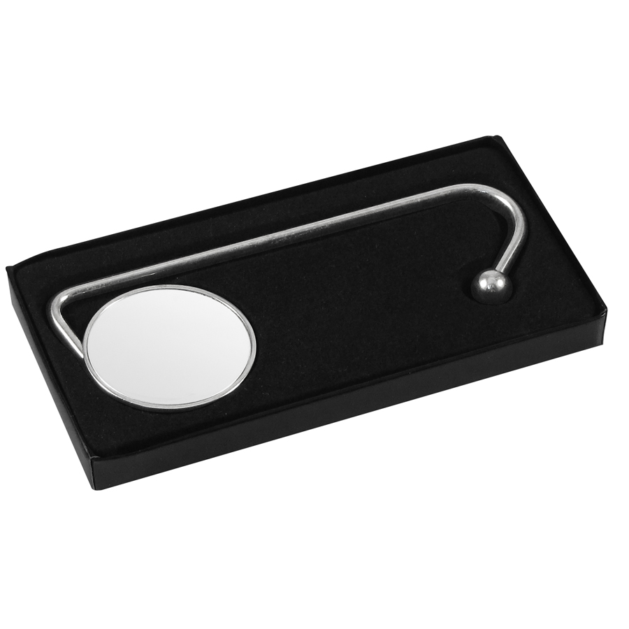 Colgador Metálico de sobremesa para Bolsos y Carteras. Presentación en estuche laminado negro con cuna aterciopelada.