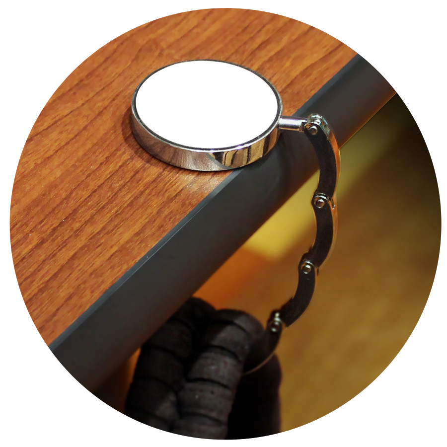 Colgador Metálico redondo de sobremesa, para Bolsos y Carteras, con círculo central para Sublimación. Presentación en estuche laminado negro con cuna aterciopelada.