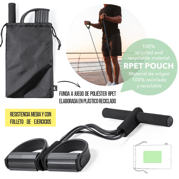 Cuerda de tensión para mantenerse en forma al aire libre o desde casa, diseñada para realizar una gran variedad de ejercicios. Fabricada en resistente combinación de ABS y EVA con asas ergonómicas acolchadas en espuma y soportes para pies recubiertos en EVA, con calapiés de seguridad. De resistencia media y con folleto de ejercicios. Presentada en funda a juego de poliéster RPET, elaborada a partir de plástico reciclado para así fomentar la reutilización de residuos plásticos y contribuir a la sostenibilidad del planeta. Etiqueta RPET distintiva en funda. Resistencia Media. Funda Poliéster RPET