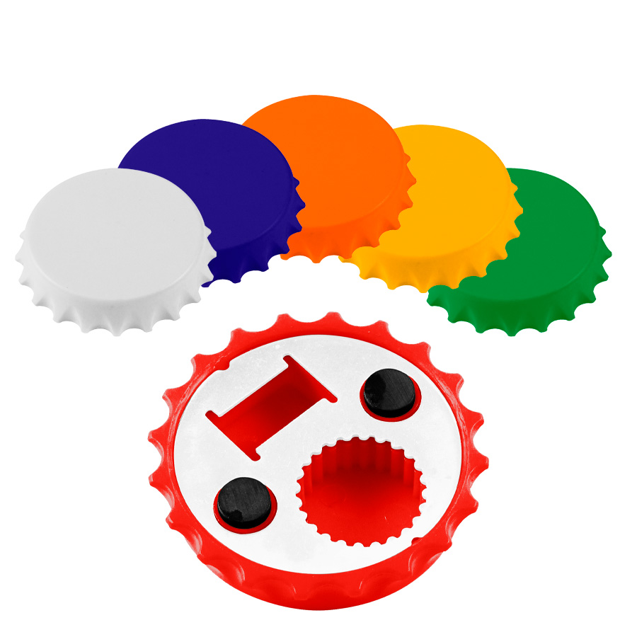 Destapador y Abridor de tapas twist-off, con forma de tapa de botella. Imantado para refigerador.