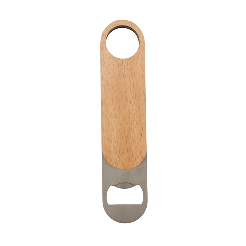 Abrebotellas fabricado en madera de haya y acero inoxidable 420SS. Dimensiones: 17,8 x 4 cm. ReUseMe.