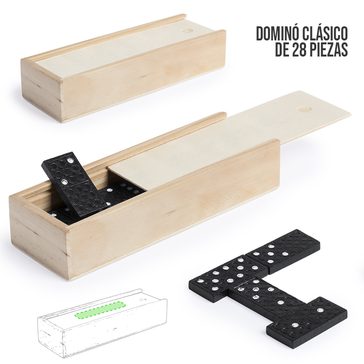Dominó clásico de 28 piezas fabricado en madera. Piezas en sobrio diseño de color negro con detalle en blanco. Presentado en estuche individual de madera con tapa. 28 Piezas