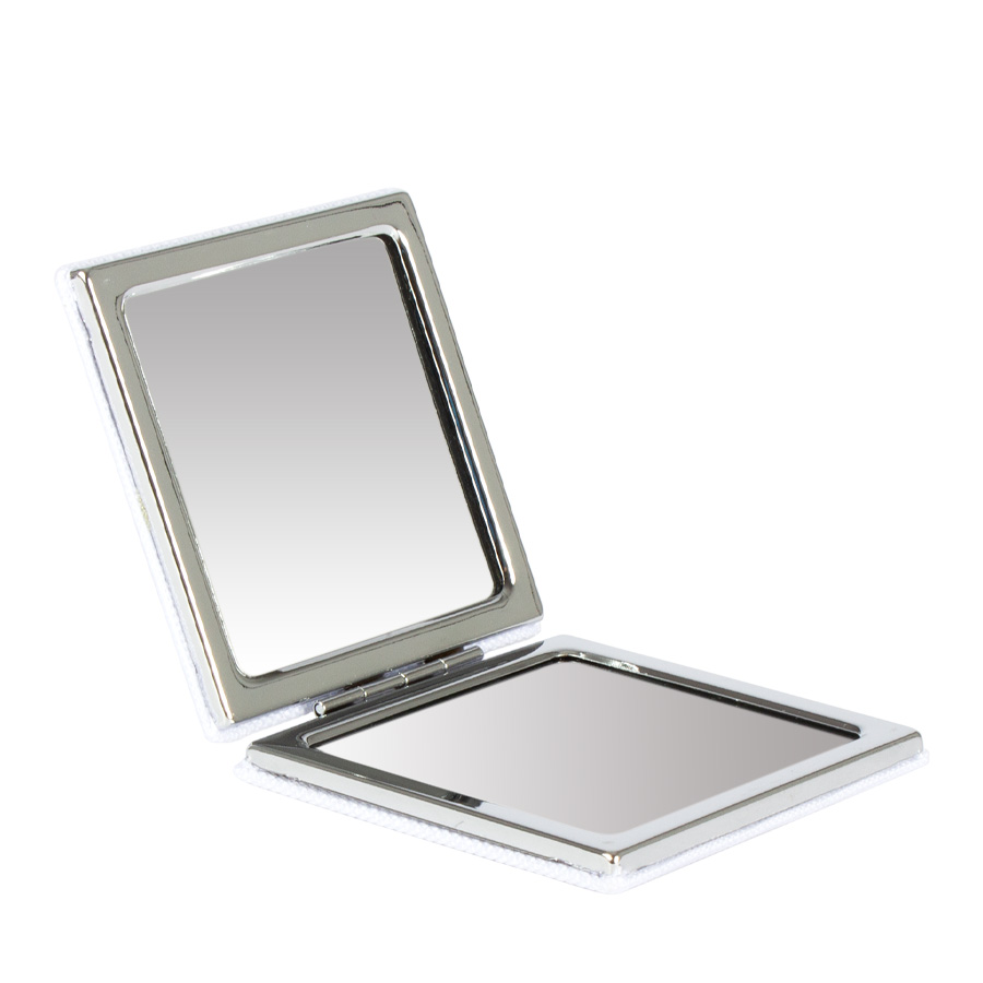Espejo metálico cuadrado doble, con 2 tapas exteriores recubiertas en poliéster color blanco, para Sublimación. Contiene un espejo normal y el otro con aumento. Sistema de cierre magnético. Presentación en bolsa PP translúcido.
