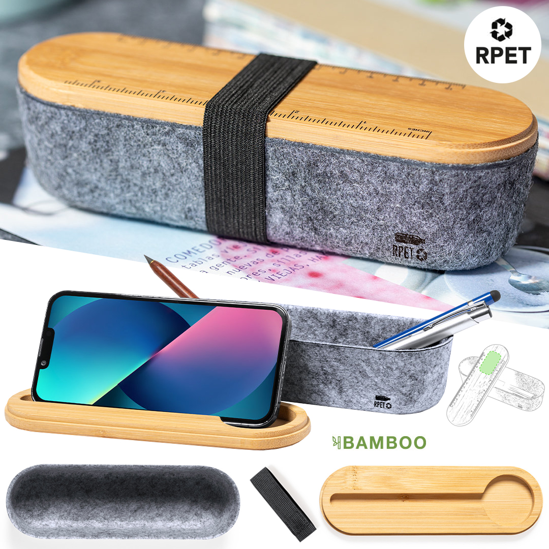 Original estuche de línea nature, con tapa de bambú y cuerpo en fieltro RPET, fruto de la combinación del proceso de reciclaje de materiales plásticos junto con la técnica milenaria de fabricación del fieltro, dando como resultado un material de eco-tendencia que, además de ser de origen reciclado, también se convierte en reciclable. Regla en tapadera (pulgadas y cm), con soporte integrado para smartphone y distintivo RPET en la parte de fieltro.