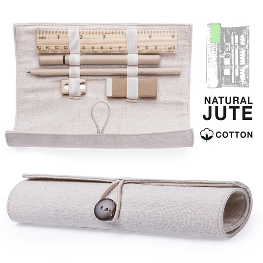 Original estuche de línea nature. Fabricado en yute y algodón, con elegante cierre de botón. Contiene 5 piezas de acabado nature: Goma de borrar, sacapuntas y bolígrafo de cartón reciclado, con lápiz y regla de madera. 5 Piezas