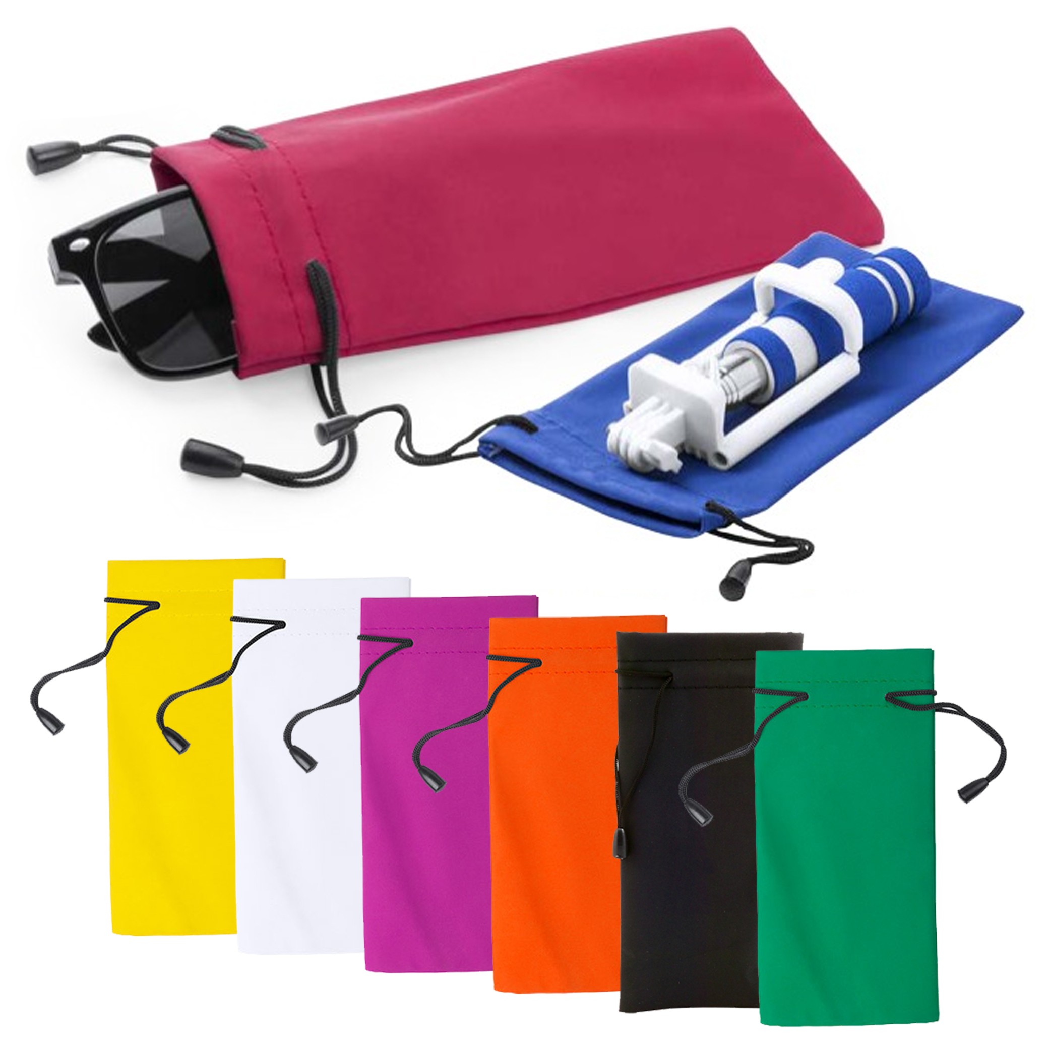 Funda paño limpiador para gafas en suave poliéster y amplia gama de divertidos colores. Con cordones autocierre.