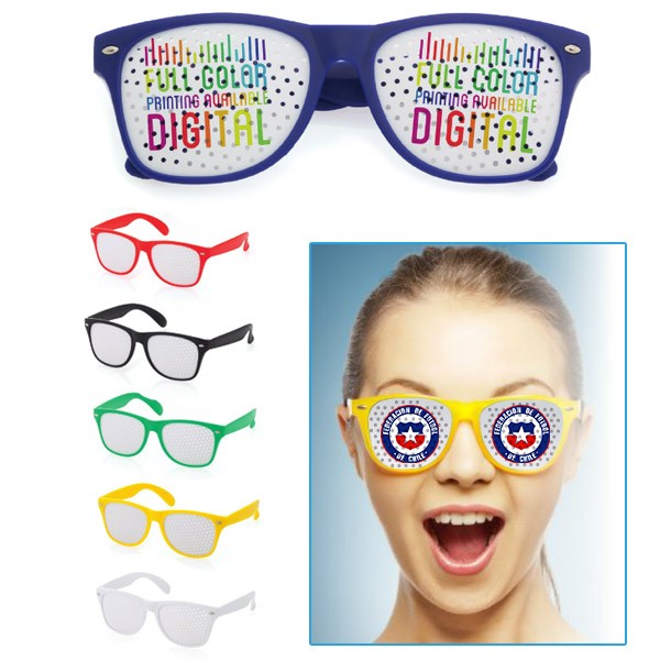 Gafas de original diseño especialmente diseñadas para marcaje a todo color digital. Con montura en divertidos colores y lentes perforadas.