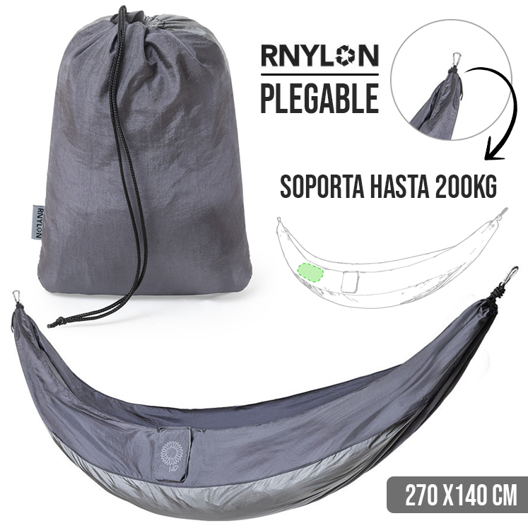 Hamaca fabricada en resistente nylon reciclado de 270x140cm, resultado de la utilización de los desechos pre y post-consumer del nailon, que se reutilizan para obtener este nuevo material, sin alterar sus propiedades y cumpliendo con los principios de las 3R (Reduce, Reutiliza, Recicla). Con resistentes cintas de amarre y mosquetones metálicos. Soporta hasta 200kg. Presentación plegado, con cinta ajustable mediante regulador. Manual de montaje incluido. Funda Nylon Reciclado