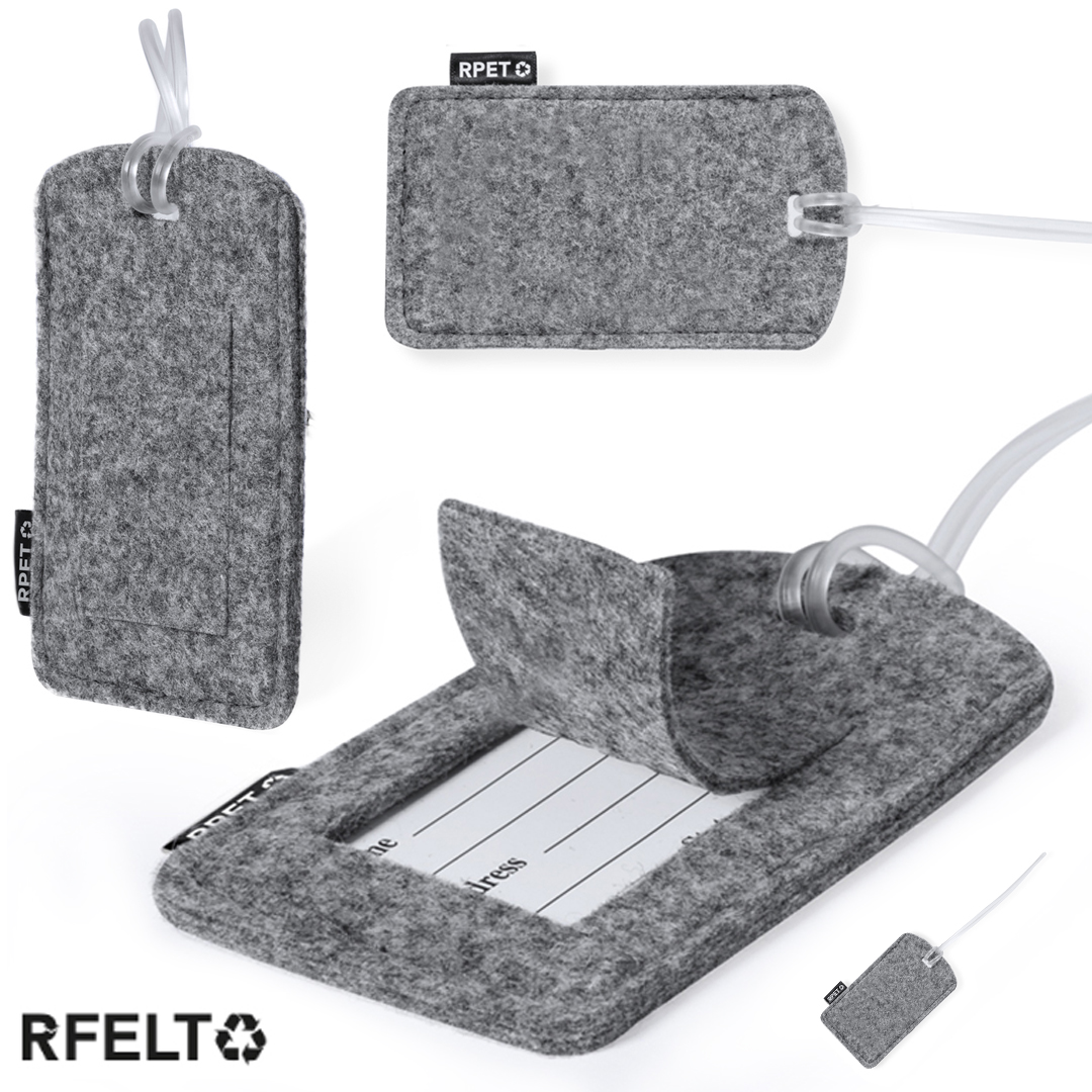 Identificador para maletas fabricado en fieltro RPET. Para amarrar a cualquier maleta gracias a su cinta flexible e indicar información básica, fabricado en fieltro RPET, con ventana y etiqueta distintiva de RPET. El fieltro RPET es fruto de la combinación del proceso de reciclaje de materiales plásticos junto con la técnica milenaria de fabricación del fieltro, dando como resultado un material de eco-tendencia que, además de ser de origen reciclado, también se convierte en reciclable.