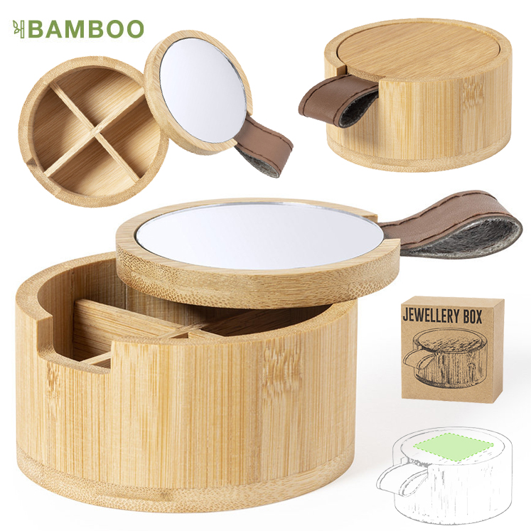 Joyero de línea nature fabricado en bambú. Con 4 compartimentos interiores, tapa con tirador de PU y espejo 1X de 6cm de diámetro integrado en tapa. Con film protector y presentado en caja individual de diseño eco. Espejo Incluido
