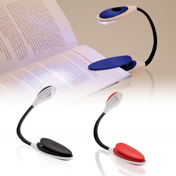 Lámpara led de lectura de diseño bicolor. Con cuerpo flexible y cómoda pinza de sujeción. Presentada en caja individual. 1 Led. Flexible. Pilas Botón Incluidas