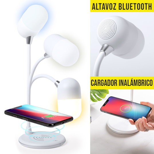 Lámpara multifunción todo en uno en acabado blanco, con altavoz Bluetooth® 4.2 de 3W de potencia y cargador inalámbrico integrados. 14 LEDs y 3 posiciones de iluminación (cálida, fría y media), ajustable en altura. Compatible con dispositivos móviles de carga inalámbrica, con cable cargador micro USB y viene presentada en una atractiva caja de diseño. 14 Ledes. Flexible. 3 Posiciones de Luz. Intensidad de Luz Regulable. Conexión Bluetooth. Potencia Sonido 3W. Conexión USB. Inalámbrico 5W