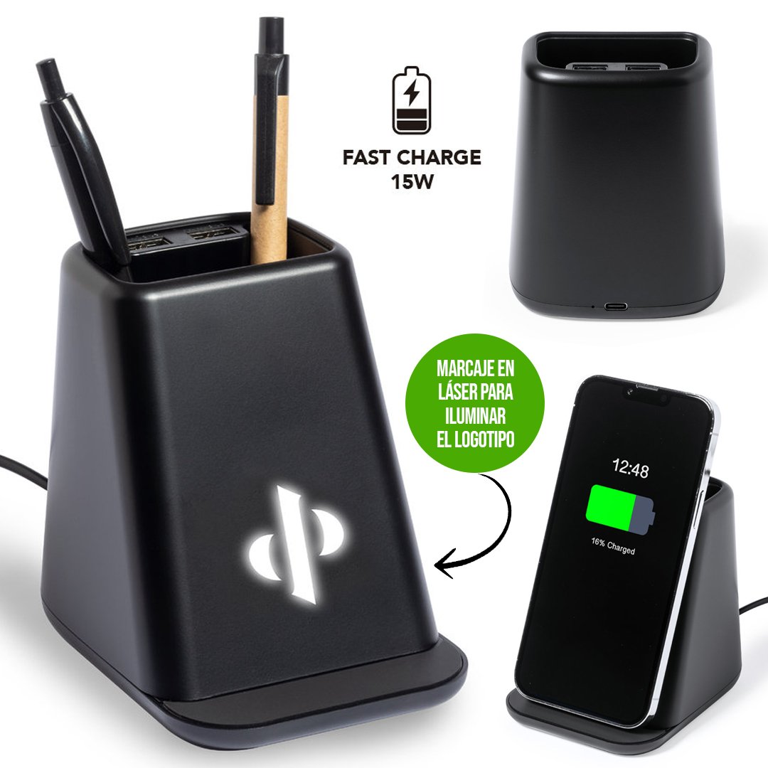 Lapicero multifunción con luz, especialmente diseñado para marcaje en láser e iluminar el logotipo.Con soporte para smartphone y cargador inalámbrico 15W integrado, compatible con dispositivos equipados con tecnología de carga inalámbrica Qi. Incluye 2 salidas USB (5V DC 2A)y cable de carga Tipo C de 150 cm. Base antideslizante y presentado en caja individual de diseño kraft, con manual de instrucciones en español e inglés.Fabricado conforme a los estándares RoHS y en cumplimiento con los siguientes requisitos de seguridad:Sistema de protección contra sobrecalentamiento.Sistema de protección contra sobrecarga.Sistema de bloqueo para evitar cortocircuitos. Luces Led. Inalámbrico 15W. 2 Salidas USB