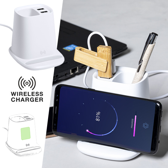 Lapicero multifunción 4 en 1, fabricado en resistente material ABS de color blanco. Con funciones lapicero, soporte para smartphone, cargador inalámbrico 5W y 2 salidas USB de 2.000 mA. Puerto USB inferior, apto para transferencia de datos. Compatible con smartphones con tecnología de carga inalámbrica. Incluye cable tipo C de 1 metro de largo y viene presentado en atractiva caja de diseño. Disponible manual de instrucciones en español e inglés. Inalámbrico 5W. 2 Salidas USB. 1 Puerto USB 2.0