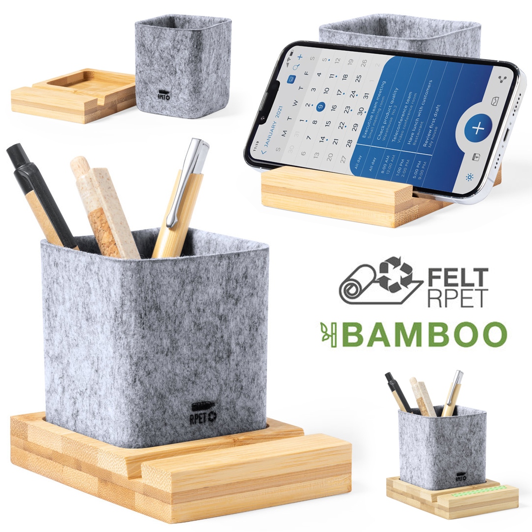 Lapicero de línea nature fabricado en fieltro RPET, con soporte para smartphone en bambú. Con distintivo fieltro RPET y presentado en caja individual de diseño kraft.El fieltro RPET reciclado es fruto de la combinación del proceso de reciclaje de materiales plásticos junto con la técnica milenaria de fabricación del fieltro, dando como resultado un material de eco-tendencia que, además de ser de origen reciclado, también se convierte en reciclable.