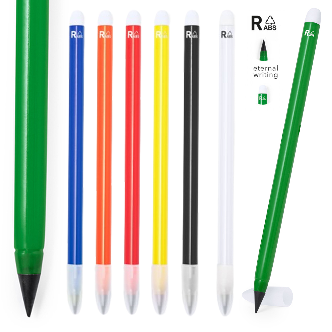 Lápiz eterno fabricado en RABS. Reutilizable y con escritura infinita, para usar siempre el mismo lápiz y no generar residuos. Incluye goma de borrar en la parte superior del lápiz y capucha para proteger la punta. Con logotipo RABS en un extremo de la caña. Disponible en una amplia gama de colores. El RABS es un plástico altamente reciclable de gran resistencia y con multitud de aplicaciones que lo convierte en una solución eco-friendly. con certificación RCS, que garantiza el origen reciclado del mismo.
