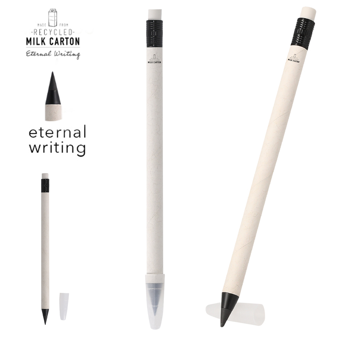 Lápiz eterno fabricado con cartones de leche reciclados. Reutilizable y con escritura infinita. Incluye goma de borrar en la parte superior del lápiz y capucha de protección. De color blanco, con detalles en negro. Con distintivo de cartón de leche reciclado en el cuerpo.Los cartones de leche se componen en su mayor parte de cartón y aluminio. Durante su proceso de reciclado, se separan los distintos materiales del envase para su reutilización y nuevo uso, contribuyendo así a recorrer el camino infinito de la economía circular. Este material se caracteriza por su alto grado de reciclabilidad, así como por su ligereza y resistencia.