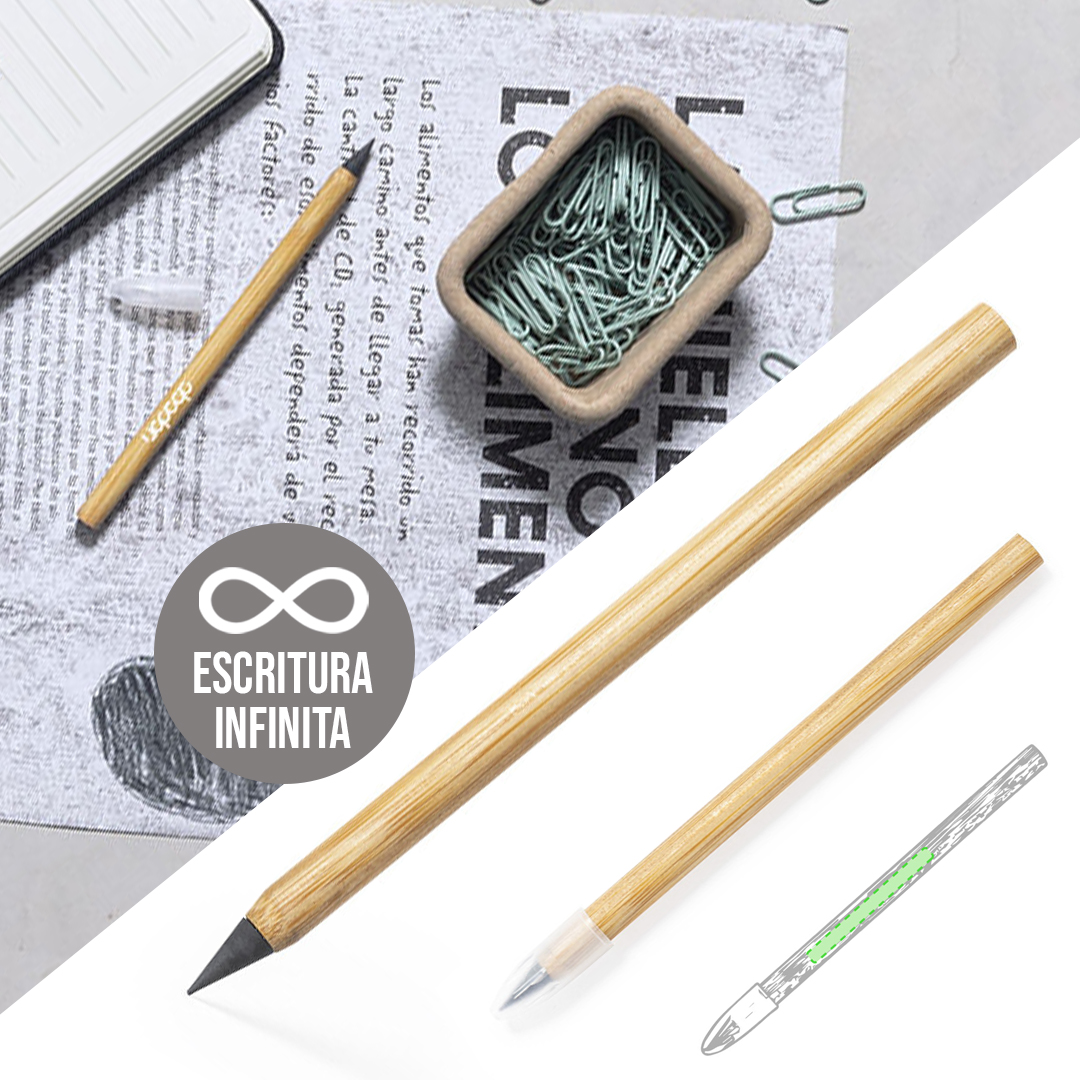 Lápiz eterno de línea nature. Fabricado en bambú, fomentando la utilización de materias primas naturales y reducir las emisiones contaminantes. Reutilizable y con escritura infinita, para así usar siempre el mismo lápiz y no generar residuos.
