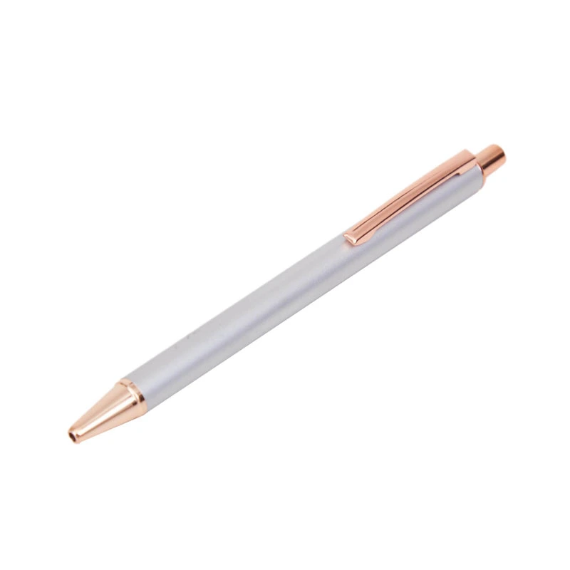 Lápiz de cuerpo de aluminio con detalles en tono cobre. Tinta color azul. Sistema de apertura retractil.