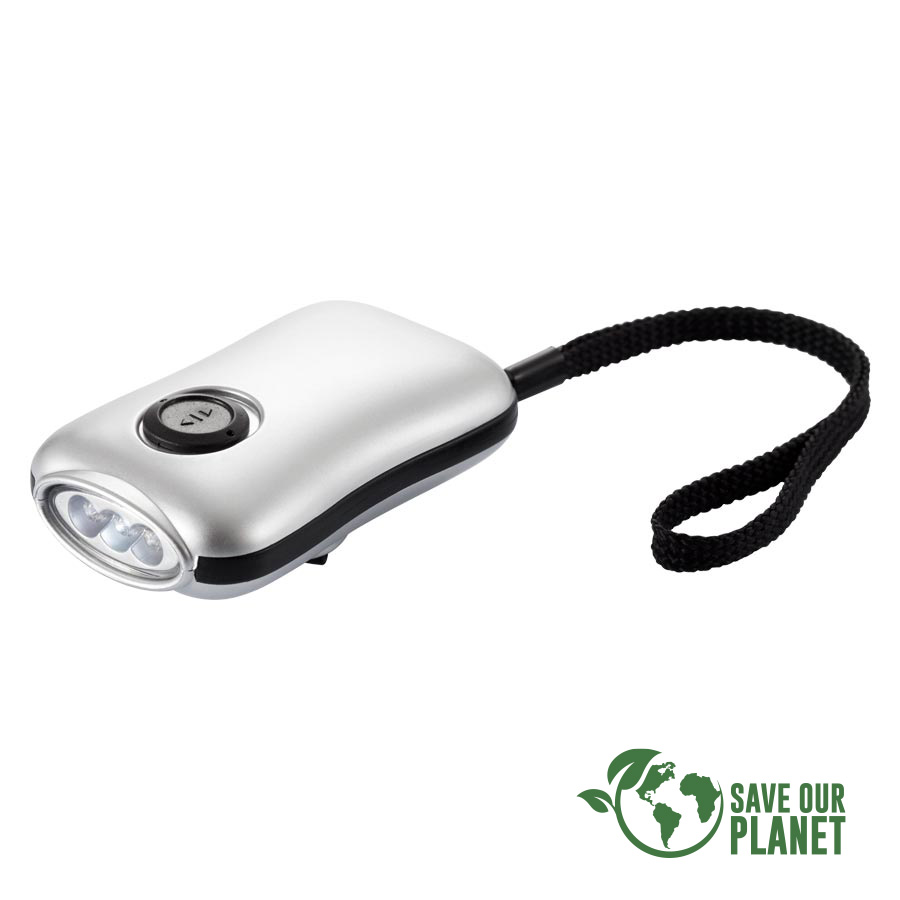 Linterna 3 LED con dínamo de manivela. Con huincha para colgar.