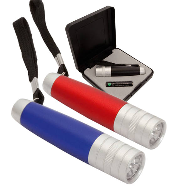 Resistente linterna con cuerpo acabado en aluminio de vivos colores, con cuerpo anti deslizante, pulsador de encendido protegido con resistente goma y cinta de transporte. Presentada en estuche individual con interior en suave espuma troquelada y pila AAA incluida.