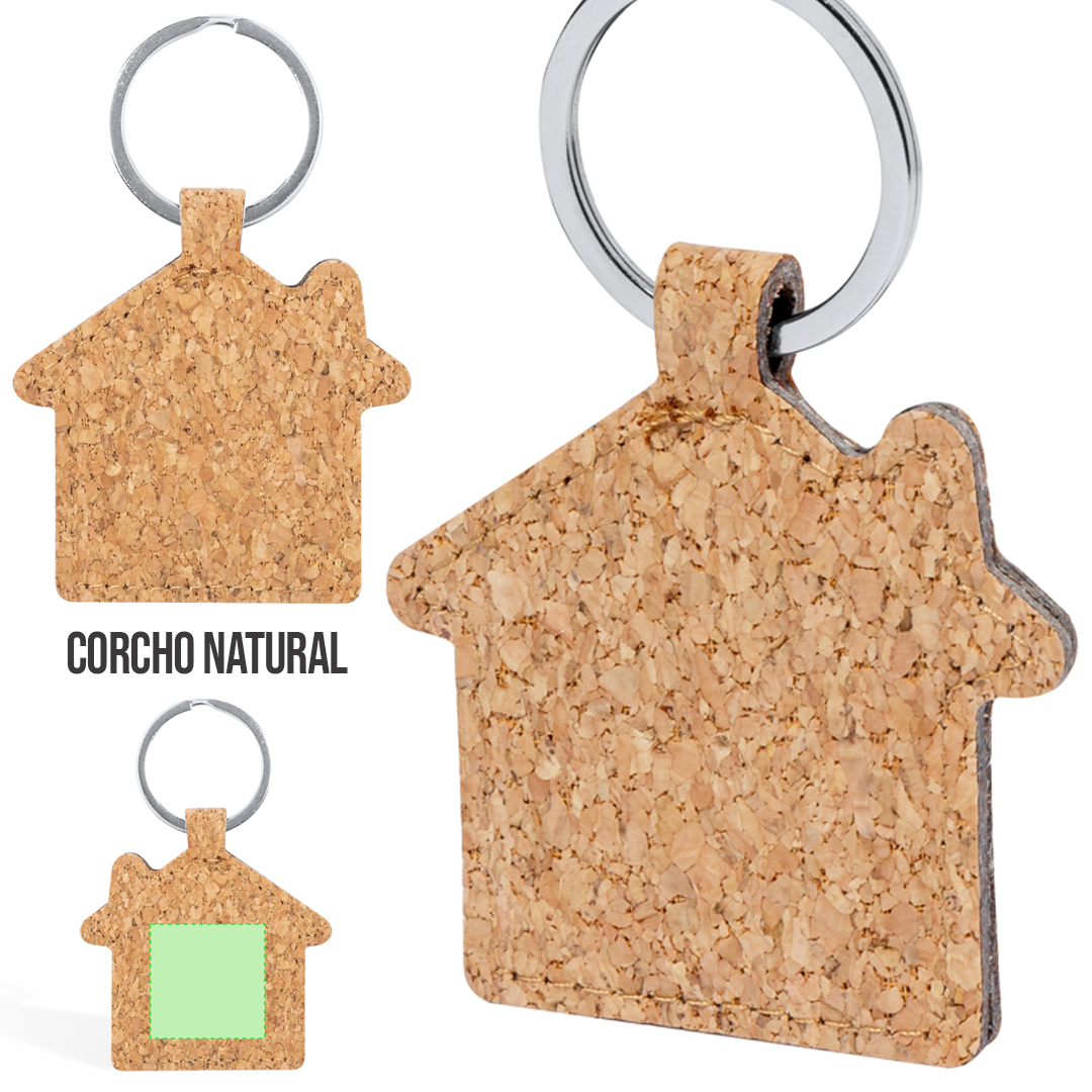 Llavero en forma de casa fabricado en corcho natural. Con amplia superficie de marcaje y presentado individualmente en bolsa reciclada. Elaborado con elementos vegetales para así fomentar la utilización de materias primas naturales y reducir las emisiones contaminantes.