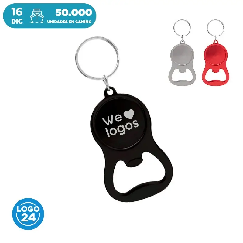 Llavero abridor tapa corona, metálico. Medidas: 4 x 6,5 x 0,3 cm. (anillo de 25 mm de diámetro). LOGO24: Producto disponible para el servicio de logueo en 24 horas respetando unidades mínimas de logueo y 1000 unidades máximas. Consultar términos y condiciones del servicio