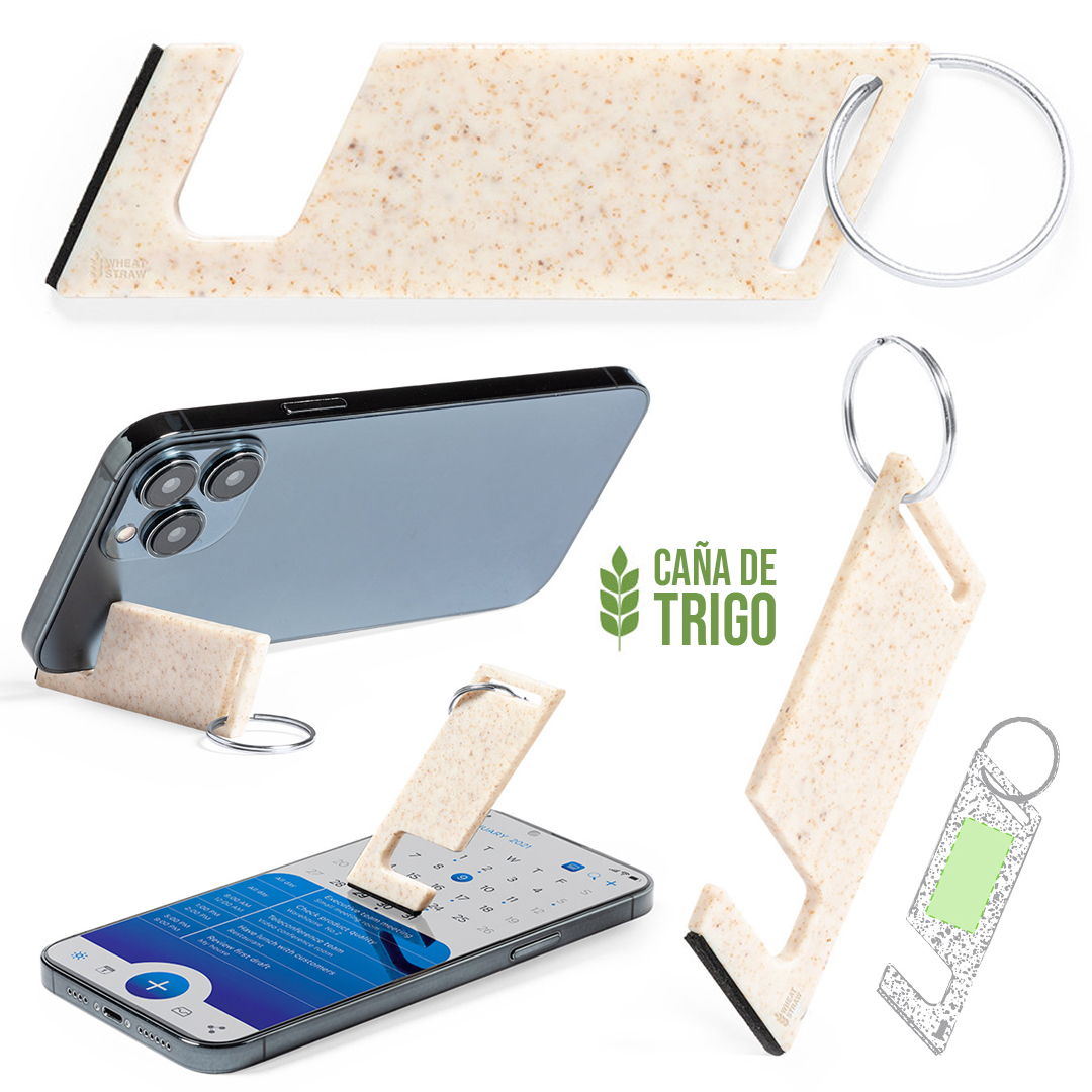 Llavero multifunción de línea nature fabricado en caña de trigo, para así fomentar la utilización de materias primas naturales y reducir las emisiones contaminantes. Con soporte para smartphone integrado y accesorio limpiapantallas incluido. Con distintivo caña de trigo en el cuerpo del llavero. Limpiapantallas Incluido