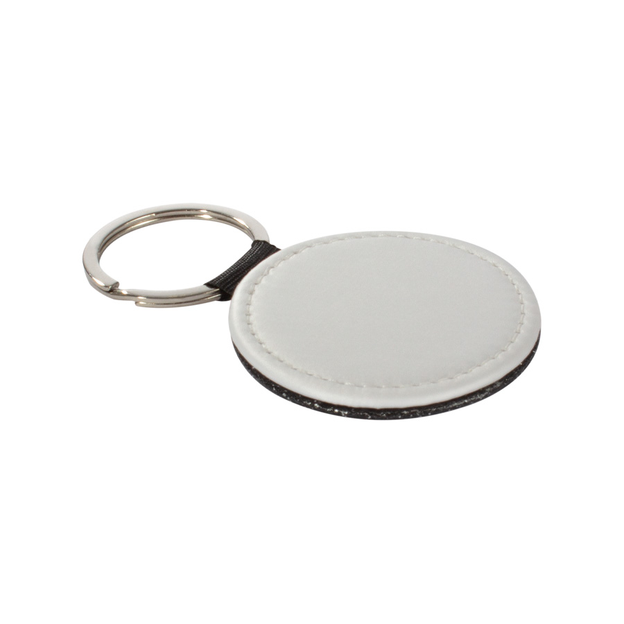Llavero redondo de PU blanco para sublimación. Reverso capa PU negro con brillo (no sublimable). Argolla de Acero inoxidable.
