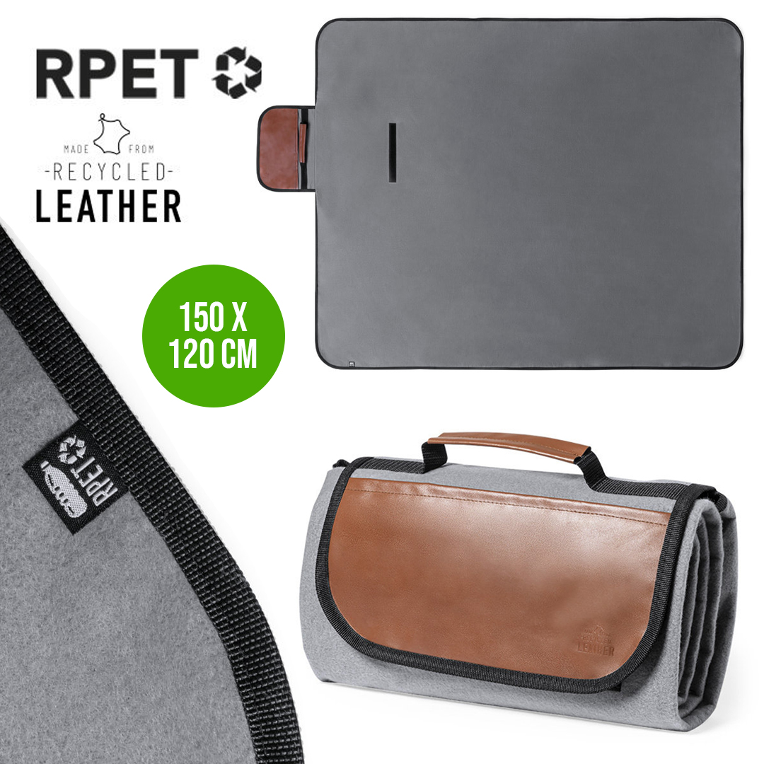 Manta de picnic premium fabricada en resistente poliéster RPET de 160g/m2 y acabado en gris. Plegable y con cierre de velcro solapa y asa en cuero reciclado con ribetes reforzados. En tamaño 120x150 cm, con base aislante en PEVA y lado para sentarse de agradable tacto. De fácil plegado y tamaño compacto, con distintivo cuero reciclado en la solapa. El material RPET se elabora a partir de plástico reciclado, para así fomentar la reutilización de residuos plásticos y ayudar a la sostenibilidad del planeta.El cuero reciclado rescata las fibras desechadas en los procesos de fabricación del cuero, minimizando el desperdicio de material, contribuyendo a reducir el impacto ambiental y manteniendo a la vez sus propiedades originales.